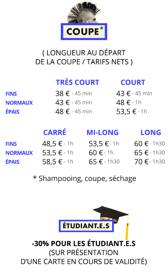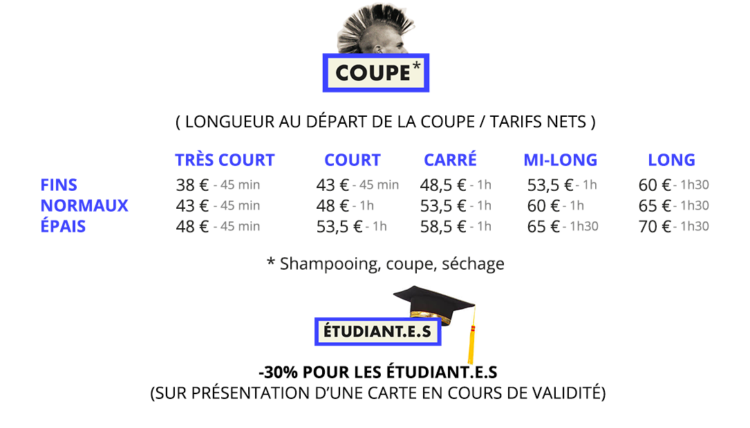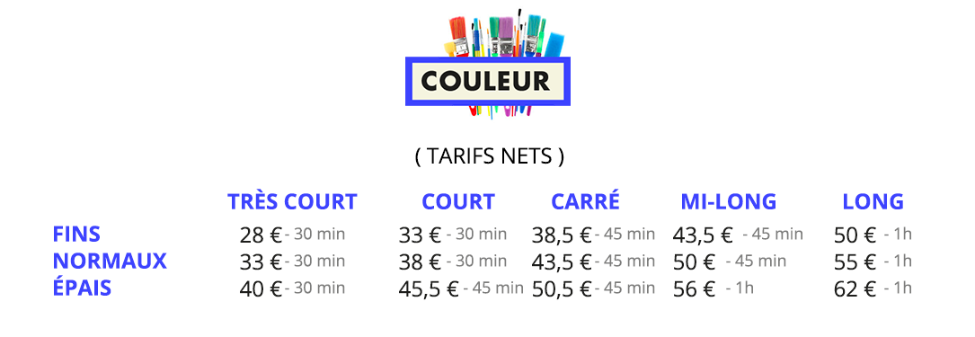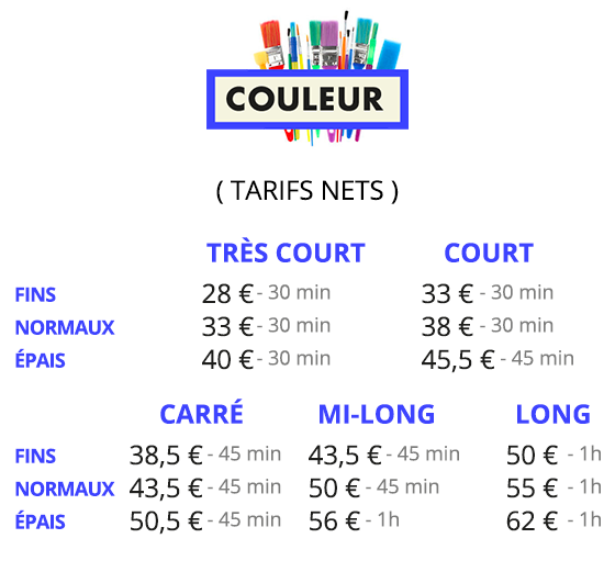 NOS TARIFS SONT NON GENRÉS. ILS S’ADAPTENT À LA LONGUEUR ET À L’ÉPAISSEUR DE VOS CHEVEUX!